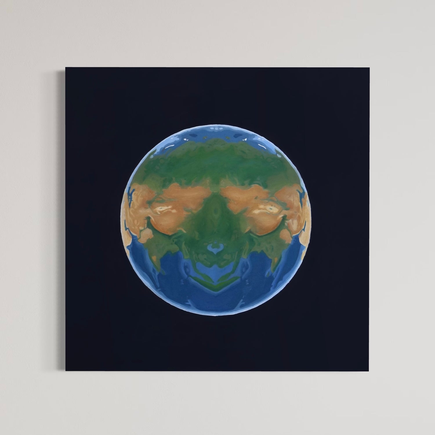 Does the Earth have a face? This work reveals the face of the super-organism "Gaia". Based on the actual geography of our planet as seen from space but through symmetry. The base of the closed eyelids are the Himalayas.