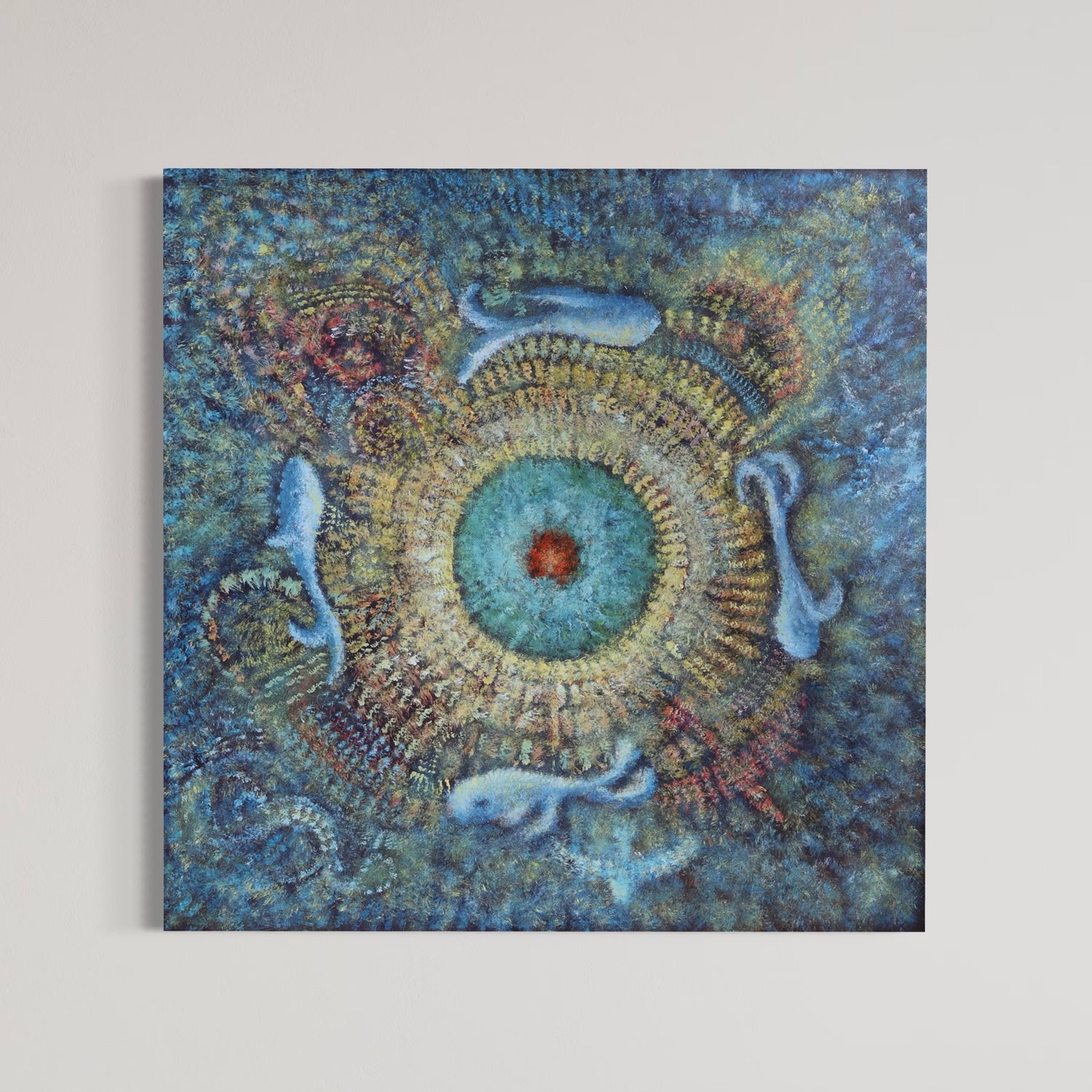 The painting revolves 360 degrees. There is no right or wrong way to view it. It celebrates the infinite number of perspectives that exist and the multiplicity of ways that life manifests. At the core is the centre of the Earth. Breaking free from the narrative of paintings being fixed entities, this work invites the viewer to participate. It gives agency to the viewer and reminds them of their agency. We are all actively participating in creating this collective experience. You are invited to revolve the world.